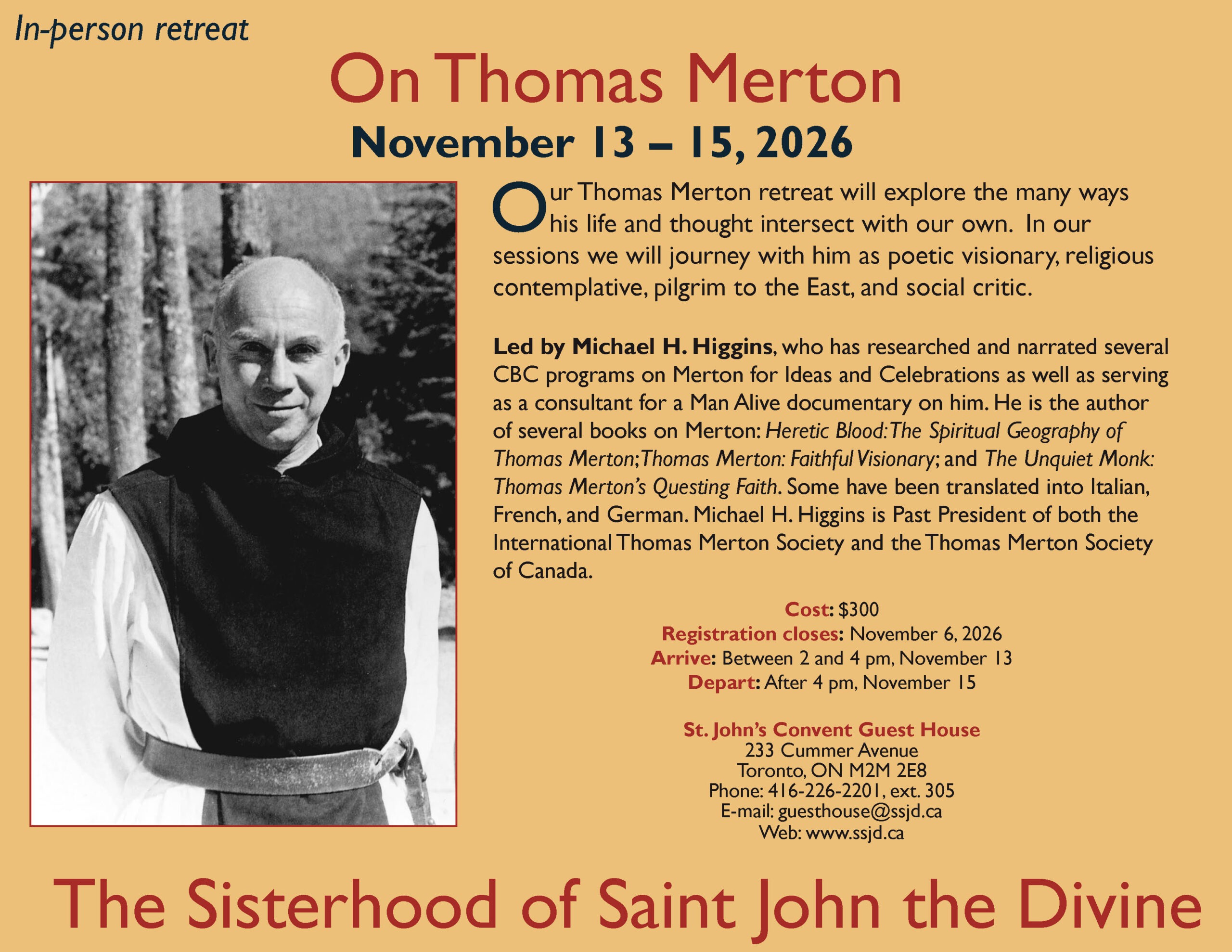 Led by: Michael H. Higgins has researched and narrated several CBC programs on Merton for Ideas and Celebrations as well as serving as a consultant for a Man Alive documentary on him. He is the author of several books on Merton: Heretic Blood: The Spiritual Geography of Thomas Merton, Thomas Merton: Faithful Visionary, and The Unquiet Monk: Thomas Merton’s Questing Faith. Some of them have been translated into Italian, French, and German. He is Past President of both the International Thomas Merton Society and the Thomas Merton Society of Canada.